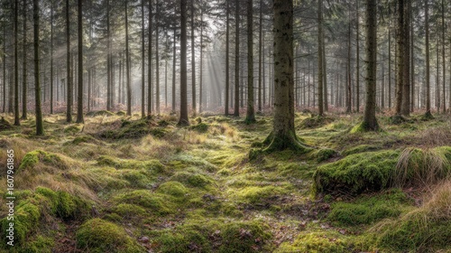© 0712, Fototapeta premium Sunlight filtering through a dense forest of tall evergreen trees.