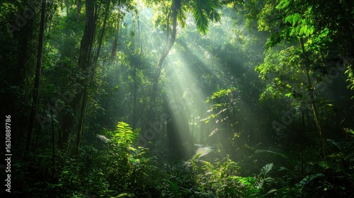 © Chotijah, Obraz premium Sunlight filtering through a dense jungle.