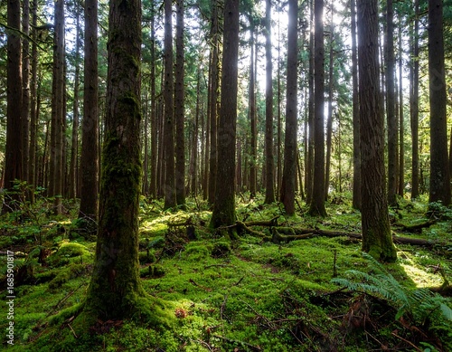 © kaya, Obraz premium Sunlight filtering through a dense mossy forest
