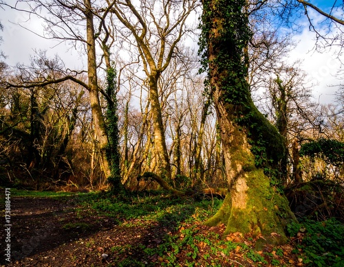 Obraz premium Sunlight filtering through a dense woodland