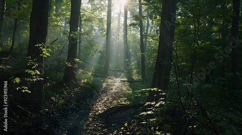 © Pascal, Fototapeta premium Sunlight filtering through a dense woodland trail