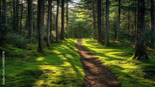 Fototapeta premium Sunlight filtering through a forest pathway.