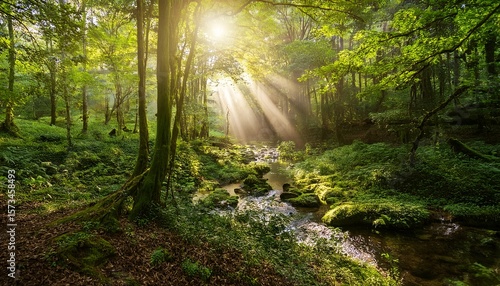 © Talia, Obraz premium sunlight filtering through a lush forest