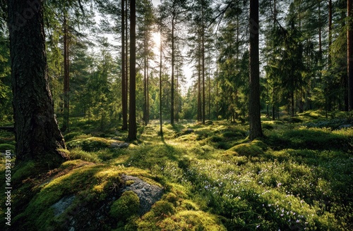 Obraz premium Sunlight filtering through a lush forest