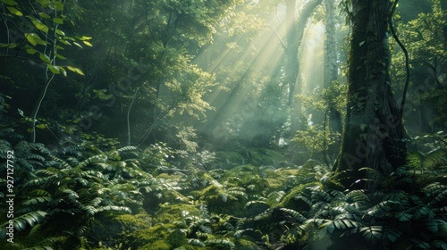 © hanafi 99d, Obraz premium Sunlight Filtering Through a Lush Forest