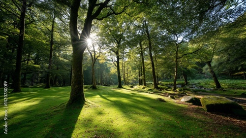 Fototapeta premium Sunlight filtering through a lush forest canopy, casting shadows on the green grass