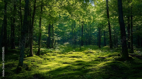 Obraz premium Sunlight filtering through a lush forest. Concept of nature, tranquility, and...