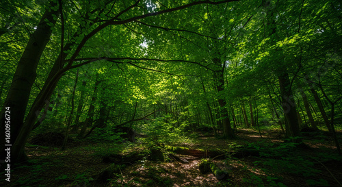 © Vikry, Fototapeta premium Sunlight filtering through a lush green canopy in a serene, deep temperate forest wilderness.