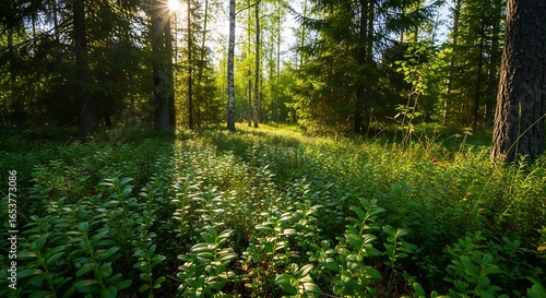 Obraz premium Sunlight Filtering Through a Lush Green Forest