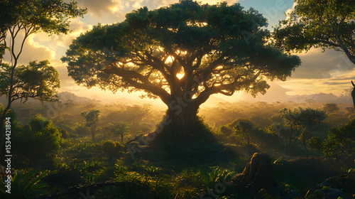 Obraz premium Sunlight filtering through a majestic tree in a lush, expansive savanna...