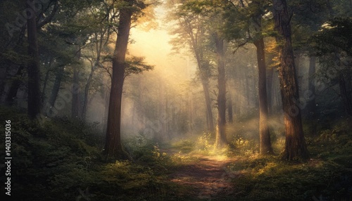 © yusilva, Obraz premium Sunlight filtering through a misty forest path.