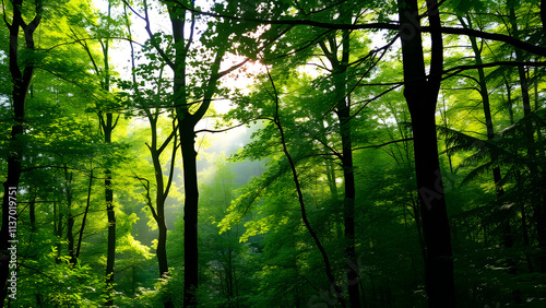 © edi, Fototapeta premium Sunlight filtering through a misty forest path in the morning