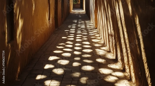 Fototapeta premium Sunlight filtering through a perforated roof, creating circles of light on a cobblestone alleyway