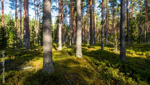 Obraz premium Sunlight filtering through a pine forest