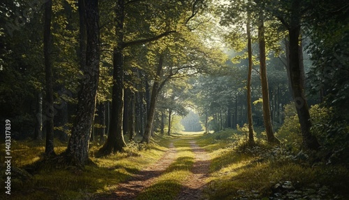 © yusilva, Obraz premium Sunlight filtering through a serene forest path.