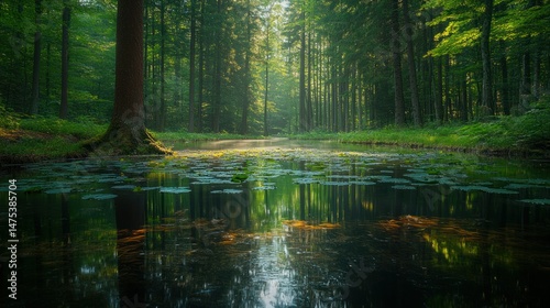 © Lemdah, Fototapeta premium Sunlight filtering through a tranquil forest path reflected in a still pond