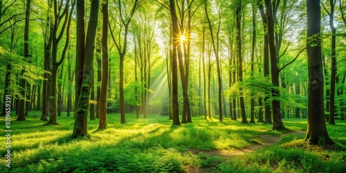 © Theerawat, Obraz premium Sunlight filtering through a verdant forest, illuminating the lush undergrowth and casting a soft glow on the towering trees