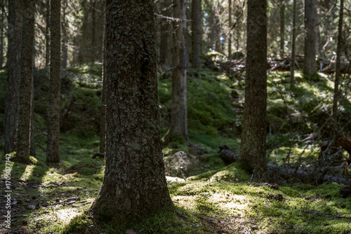 © Joose, Fototapeta premium Sunlight filtering through an old forest canopy