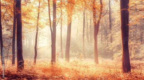 Obraz premium Sunlight filtering through autumn trees in a serene forest setting.