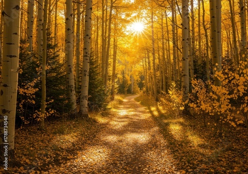 Obraz premium Sunlight filtering through brilliant yellow aspen forest, illuminating a peaceful dirt trail covered in fallen gold leaves ,autumn, dirt, nature