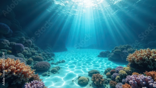 Fototapeta premium Sunlight filtering through clear ocean water over a coral reef with sandy seabed