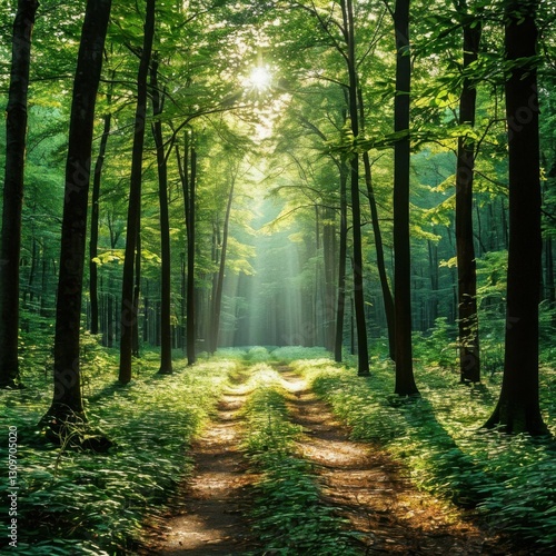 © Artem Arhipenko, Obraz premium Sunlight filtering through dense foliage creating light patches on the ground. Generated AI