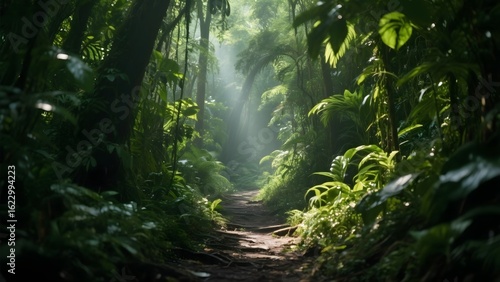 Obraz premium Sunlight filtering through dense foliage illuminates a serene forest path