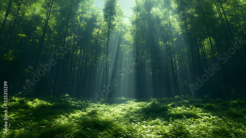 Fototapeta premium Sunlight filtering through dense forest, illuminating lush green undergrowth