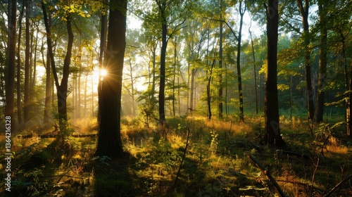 Obraz premium Sunlight Filtering Through Dense Forest Revealing Natural Serenity