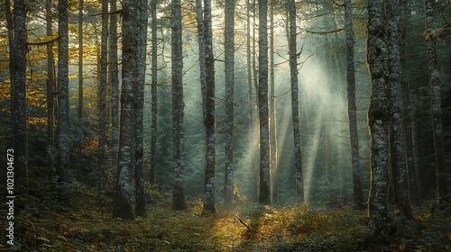 © kayudamar, Fototapeta premium Sunlight Filtering Through Dense Forest Trees