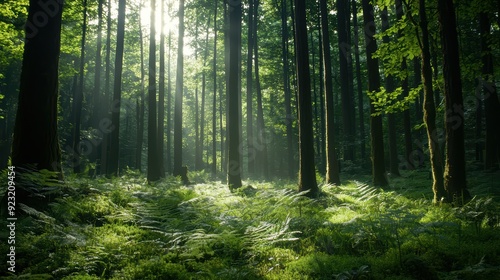© FoxGrafy, Obraz premium Sunlight Filtering Through Dense Forest Trees with Lush Greenery and Ferns on the Forest Floor