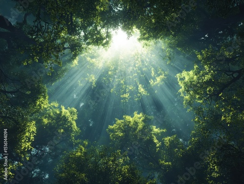 © Nakorn, Obraz premium Sunlight filtering through dense green canopy enchanted forest nature scene tranquil environment aerial view serenity