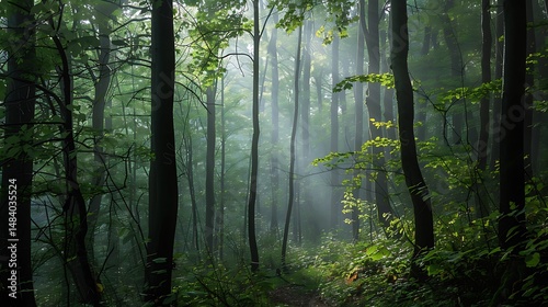© atar, Fototapeta premium Sunlight Filtering Through Dense Green Forest Creating Atmospheric Scene