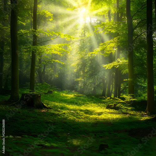 Fototapeta premium Sunlight filtering through dense green forest trees with misty atmosphere