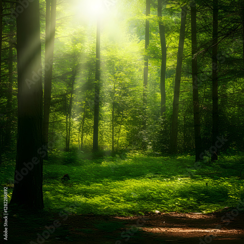Fototapeta premium Sunlight filtering through dense green forest trees with misty atmosphere