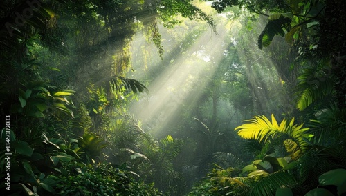 © Selsi, Obraz premium Sunlight filtering through dense jungle foliage (1)