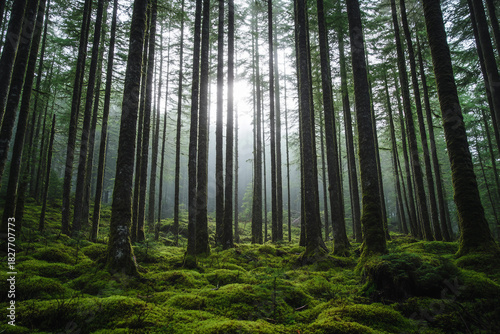 © Tetiana, Obraz premium Sunlight filtering through dense lush forest canopy in vibrant green ecosystem landscape with moss and trees, generative ai