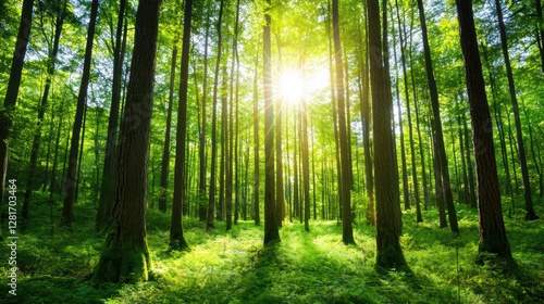 © JK_kyoto, Obraz premium Sunlight Filtering Through Dense Rainforest Canopy in Nature