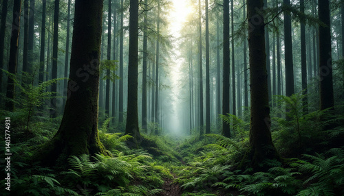 Fototapeta premium Sunlight filtering through dense trees in a tranquil forest during the early morning hours