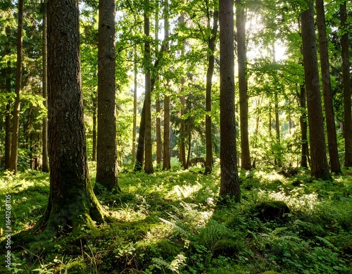 © botol, Fototapeta premium Sunlight filtering through forest canopy