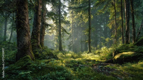Naklejka premium Sunlight filtering through forest canopy