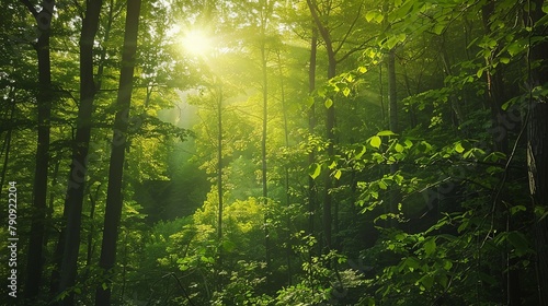 © Creative_Bringer, Obraz premium Sunlight filtering through forest panoramic view