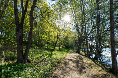 © Joose, Fototapeta premium Sunlight Filtering Through Forest Trees Along a Winding Path