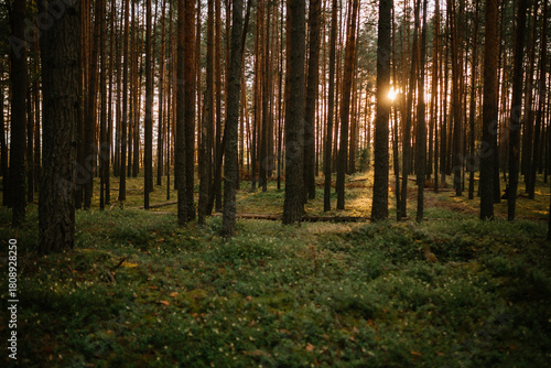 © Julia, Naklejka premium Sunlight Filtering Through Forest Trees at Dawn