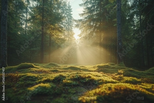Fototapeta premium Sunlight filtering through forest trees creating golden glow