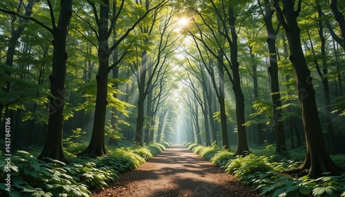 © Mehedi, Naklejka premium Sunlight Filtering Through Green Forest Trees on a Peaceful Path – 8k Nature Background.