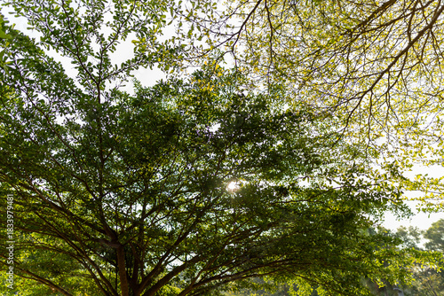 Obraz premium Sunlight filtering through green leaves and tree canopies, creating a calm...