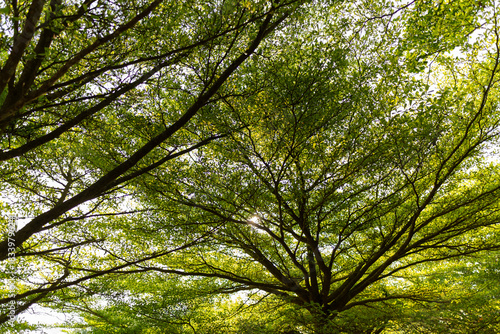 Fototapeta premium Sunlight filtering through green leaves and tree canopies, creating a calm natural background.