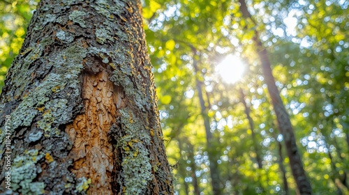 © kaiserseeing, Obraz premium Sunlight Filtering Through Leaves on Tree Bark in Forest Setting