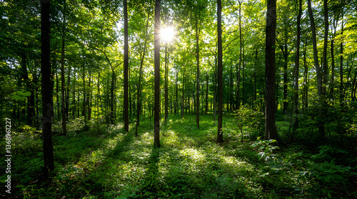 Obraz premium Sunlight Filtering Through Lush Green Forest